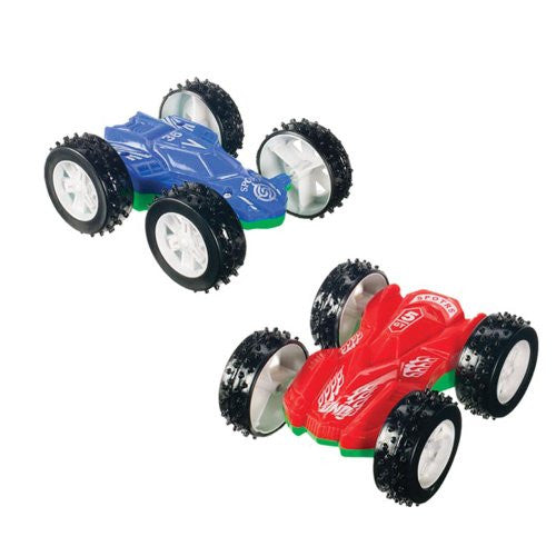 These 4.5 inch long cars are tons of fun to play with and race! Rev them up by pushing them on the ground several times without letting go. The more you rev them up the faster and further they will go! When you are ready, let them go and watch as they zoom away! Don't worry about them hitting obstacles because they are double sided! When they crash into a door, wall, or any obstacle they will just bounce off and flip over and keep going! These cars are made of durable plastic with all-terrain rubber wheels. Colors and design of cars may vary. Includes two Flip Cars. Race them with your friends!