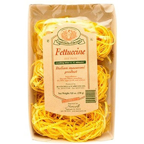 Since the early 1900's, Rustichella d'Abruzzo has been making pasta from natural ingredients and extruded through hand carved bronze dies, some of which date from the 19th-century, resulting in a rustic and textured noodle. Rustichella d'Abruzzo pasta is air dried for a crucial 40-56 hours, which creates a dense, flavorful pasta that cooks perfectly al dente. FETTUCCINE | A rich pasta with a brilliant yellow color derived from the egg yolks used in the recipe. Perfect with cream or butter sauces.
