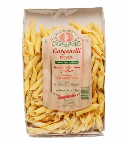 Since the early 1900's, Rustichella d'Abruzzo has been making pasta from natural ingredients and extruded through hand carved bronze dies, some of which date from the 19th-century, resulting in a rustic and textured noodle. Rustichella d'Abruzzo pasta is air dried for a crucial 40-56 hours, which creates a dense, flavorful pasta that cooks perfectly al dente. GARGANELLI | short rolled pasta shape with ridges on the outside. Perfect with butter or cream-based sauces. Fancy Food Show Silver Award Winner