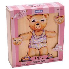 The Emma moody bear puzzle form Schylling toys the world leader in traditional toys and clasic fun. Emma moody bear is a classic, wooden puzzle for the inquisitive toddler. The puzzle includes 18 pieces. Complete her from ears to paw. Swap out the faces to change her mood. Happy, sad, surprised, sleepy, worried or angry. Use her mood to create a story. Mix and match her shirts and pants to create any look you'd like. The set included 18 pieces, 6 mood faces and 12 outfit pieces. Comes in a beautifully built 6 inch wooden box with a sliding lid.