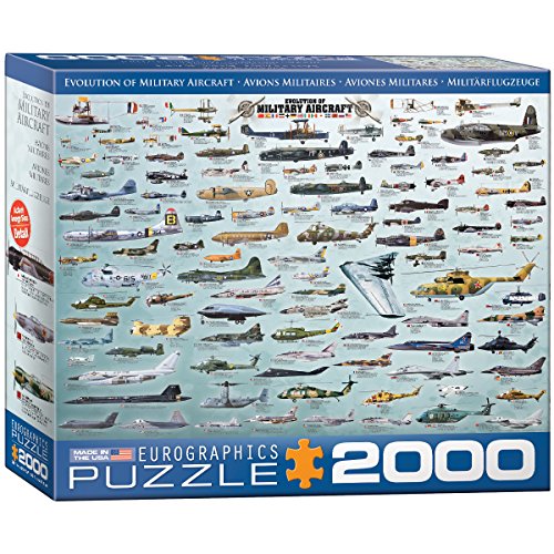 EuroGraphics Evolution of Military Aircraft 2000-Piece Puzzle. Box size: 12" x 10" Puzzle Dimensions: 38.25" x 26.63" For anyone who loves the history of aviation. This image shows the incredible diversity of historic and contemporary military aircraft. Strong high-quality puzzle pieces. Made from recycled board and printed with vegetable based ink. This superior quality puzzle will delight and educate all at the same time.
