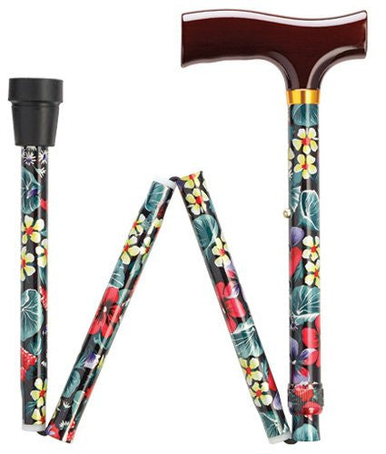 Quality women's folding walking cane comes in a fashionable Night Flowers design and folds for convenient storage or travel. Durable wooden handle offers a smooth, stable grip. Collapsible walking can has a non-skid rubber tip. Length adjusts from 33"-37".