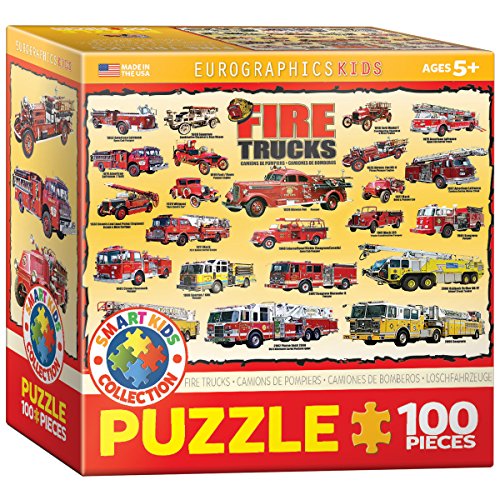 EuroGraphics Vintage Fire Engines 100-Piece Puzzle. Box size: 6" x 6" x 2.37". Finished Size: 10" x 13". Kids are always fascinated with firefighters and their brilliant and noisy trucks. They will love playing with this educative jigsaw puzzle featuring vintage and modern fire trucks. Strong high-quality puzzle pieces. Made from recycled board and printed with vegetable based ink. This superior quality puzzle will delight and educate all at the same time.