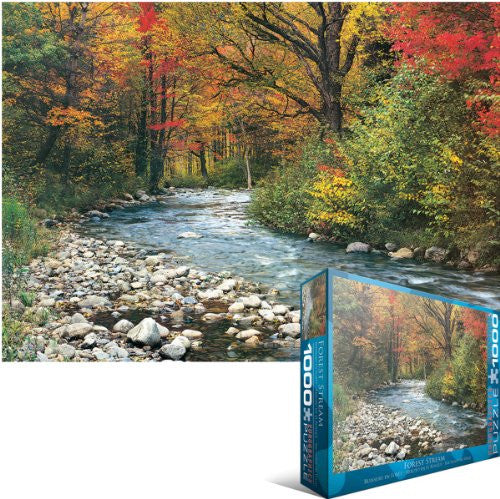 Euro Graphics forest stream 1000-Piece puzzle. Box size: 10" x 14" x 2.37". finished size: 19.25" x 26.5". this soothing image will transport you to a picturesque scene of a clear, fresh stream, surrounded by trees, undergrowth, foliage, rocks and flowers. Strong high-quality puzzle pieces. Made from recycled board and printed with vegetable based ink. This superior quality puzzle will delight and educate all at the same time.
