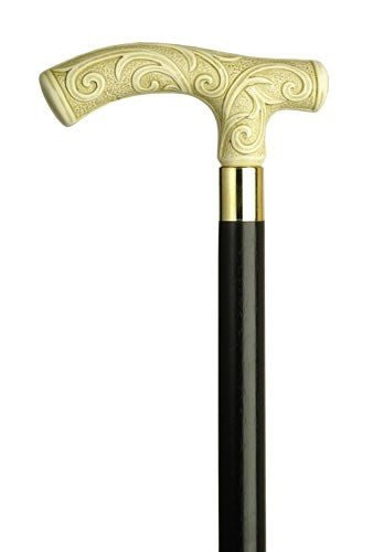 Antique ivory derby handle-high impact durable plastic handle with brass collar on black wood shaft, 36" long with rubber tip. Manufacturers recommended weight limit of 250 lbs.