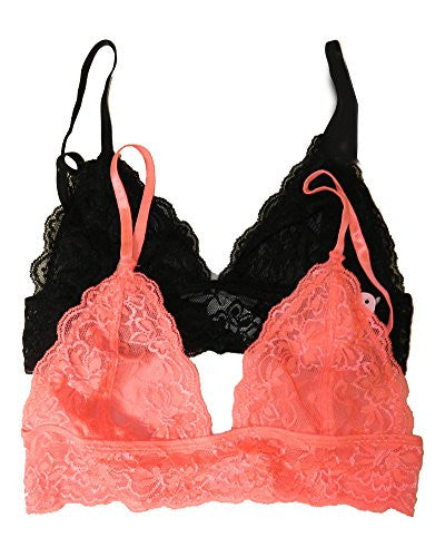 Full Lace Triangle Bralette with Hook Clasp - Black and Full Lace Triangle Bralette with Hook Clasp - Coral, Small/Medium (Pack of 2)