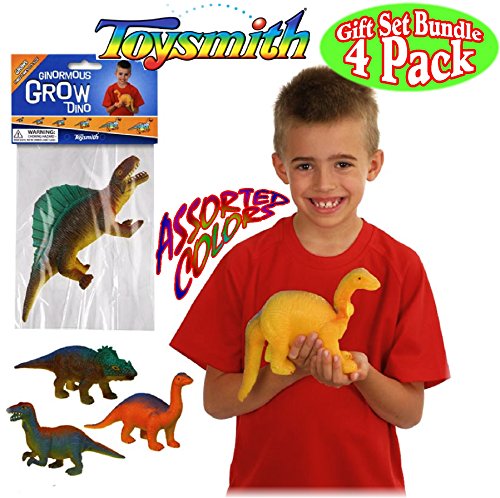 Toysmith Ginormous Grow Dinos (Dinosaurs) Gift Set Bundle - 4 Pack (Assorted Dinos & Colors), is an AWESOME set! These dinosaurs are 5 inches long before you soak them in water. Then watch them grow until they reach their 14 inch full size! Grows to maximum size in about 48 hours. Once you're finished playing, dry it out and start all over again. Makes a great gift & is perfect for schools, party favors, stocking stuffers, baskets, special needs, the office, stress relief and so much more! For Ages 5 and up - Fun for the whole family!
