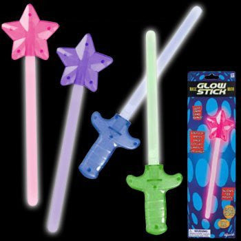 Add sparkle to fantasy play with this assortment of colorful glow-stick wands and swords. Each 10.5 inch long wand will last for hours. The perfect addition to jazz up an trick-or-treating experience. One per order. Random assortment.