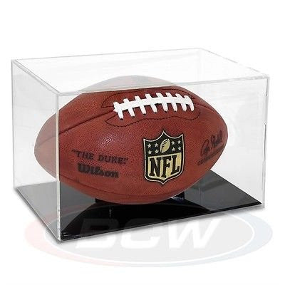The Ball Qube Grandstand Football Display is made of high impact, crystal clear polystyrene and features a 2 piece design. - Holds a regulation sized football - Stands for Easier Placement of Ball - Black High - Gloss Base - 2 piece design - Autograph Information Panel - Crystal Clear / Archival Quality - UV Protection Upgraded added (98%) - Made in U.S.A. Dimensions - Exterior 7 1/2 X 11 3/4 X 7 3/8 - Interior 7 X 11 3/8 x 7 fbx