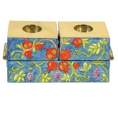 The Menora opens for Hanukkah Candle Lighting, and when used as Shabbat Candlesticks during the year it remains closed. Hand painted Displaying pretty designs when open and closed.