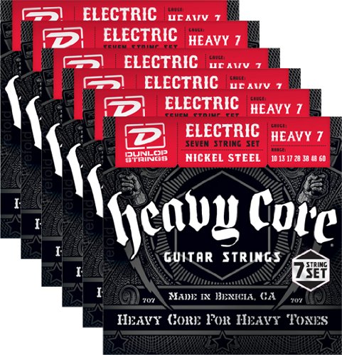 The latest addition to Dunlop Heavy Core electric guitar strings series is our Heavy Core 7 String set. Dunlop's Seven String set gauge was specifically designed for definition, tonal balance and superior intonation when playing in dropped or lowered tuning styles. Heavy Core Seven incorporates a unique core wire and proprietary wrap ratios to offer players the ability to really "dig in" while retaining a tight low end, focused midrange and smooth top-end when playing clean or distorted. Every set of Dunlop Strings come packaged utilizing three levels of moisture protection and sealed in a VCI Fresh Technology (Vapor Corrosion Inhibitor) bag to guarantee that your strings arrive as fresh as the day they were made. Great for standard B, B with dropped A, 1/2 step and B Flat tunings and can also be used with a baritone guitar. Baritone players will feel right at home using Heavy Core 7's six lower strings for their instruments and saving the high E (.010) as a back up for one of their six string electrics. https://youtu.be/CZeQquV0nmQ