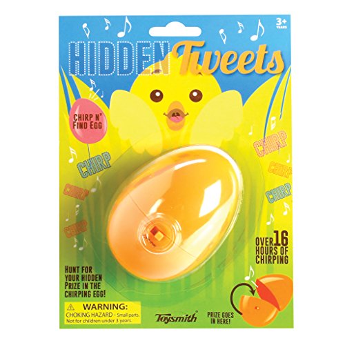 Enjoy hours of fun with the Toysmith Hidden Tweets (Assorted Colors). Add sound to egg hunts with these chirping eggs. Hide several of these eggs with prizes for a fun time with friends and family. With over 16 hours of battery life, these eggs can be hidden inside or outside well in advance. Flip the switch for chirps that repeat every 20 seconds. These eggs are recommended for ages 3 and up.