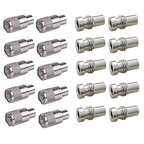 LOT OF 10 AMPHENOL PL-259/ UHF COAX CONNECTORS (083-1SP-15RFX) WITH RG59 REDUCERS (083-168-RFX). NICKEL PLATED BRASS BODY. SILVER TIP, MICA FILLED PHENOLIC DIELECTRIC. REDUCERS INCLUDED FOR USE WITH RG-/U 59. THIS LISTING IS FOR A QUANTITY OF 10