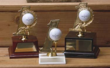 Displays hole-in-one ball on wooden base with engraving plate. Measures 4 1/2" x 4 1/2" x 7 1/2".