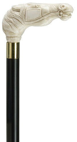 Men's antique ivory horse head with bridal, constructed of high impact durable plastic with brass collar on black wood shaft, 36" long with rubber tip.