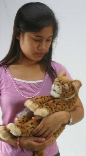 The Hansa Leopard Cub is hand-crafted of realistic plush. The coat is meticulously cut by hand, never stamped out by machine. Gentle paws, swishing tail, and especially soulful eyes and face is lovingly detailed to give the life-like look. The Leopard Cub comes with a Toys that Teach tag describing, in detail, the animals habitat, lifestyle, gestation period, care of young, and eating habits. Realistic plush stuffed animal. Each animal is handcrafted. Each Stuffed animal is designed from portraits of its real-life counterpart. Comes With Hansa Teaching Tag, Elaborating on the life and habits of the animal. Length: 7". Width: 7". Height: 15.75".