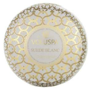 Voluspa Maison Blanc 2 Wick Candle in Suede Blanc combines notes of buttery soft sueded leather and rich cedar. Approximate burn time 50 hours.