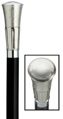 Silver Men's straight formal cane with 3 1/4" high embossed cap, black wood shaft, 36" long with rubber tip. Cap is available in gold or silver finish.
