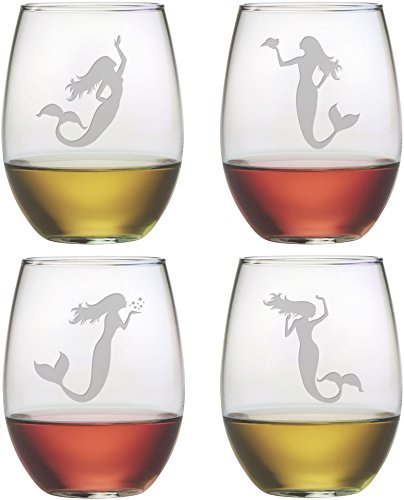 Journey beneath the seas with these enchanting Mermaid Stemless Wine Glasses. Each 21-ounce stemless tumbler in this set of four is sand etched with a different mermaid silhouette.