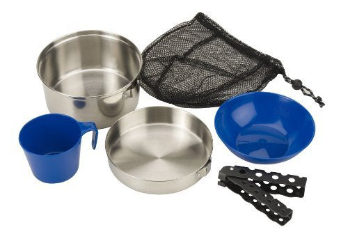 Includes dual-use fry pan & lid, cooking pot, mug, bowl, and pan gripper Made of durable #304-grade steel Bowl and cup are BPA-free polypropylene and are dishwasher-safe Nests together for easy storage Mesh carry bag included
