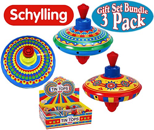 Schylling Little Mini Tin Tops Complete Gift Set Bundle - 3 Pack, is AWESOME! Complete Gift Set Bundle Includes All Three Styles of Schylling's Little Mini Tin Tops! Spin the top and listen to them hum! These colorful tin tops are fun for everyone!Makes a great gift and is perfect for party favors, baskets, stocking stuffers, stress relief, office toys, special needs and so much more. Each Colorful Top Measures 5.5" x 5.5" x 5.5". For Ages 3 and up - Fun for the whole family!