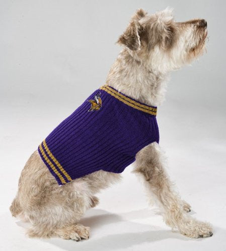 Measurements: X-Small 6"-9", Small 8"-12", Medium 14"-18", Large 20"-24". Flaunt your doggie around in the MINNESOTA VIKINGS Dog Sweater. This acrylic knit turtleneck sweater features the embroidered team logo and an easy fit ribbed front panel. Machine wash delicate, cold water. Lay flat to dry. Get your four-legged friend in the game with the Pets FirstTM pet sweater! Your pup will be proud to wear this 100% cotton sweater embroidered with your favorite NFL® team's name and logo. It features team-colored stripes at the neckline and hem.