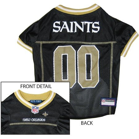 Official NFL NEW ORLEANS SAINTS Pet Jersey. 100% satin and poly mesh jersey with woven trim on neck and sleeves. Back has screen printed logo type, numbers, and woven jock tag. Front has screen printed NFL team logo. Size XL.