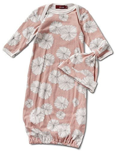 Made with GOTS certified Organic Cotton. Available in one size 0/3M Elastic bottom gown with knotted hat. Packaged in a kraft gift box
