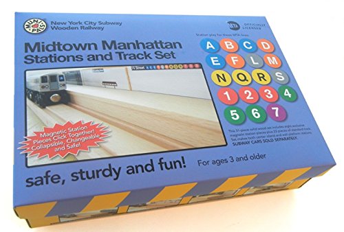 Plays with all Standard Wooden Railway Systems Magnetic Solid Wood Station Pieces click to align together Each Station Wall piece has 4 different Station Scenes Midtown Stations include 59th Street, 42nd Street, 34th Street & 14th Street Stations Wooden Subway cars are sold separately