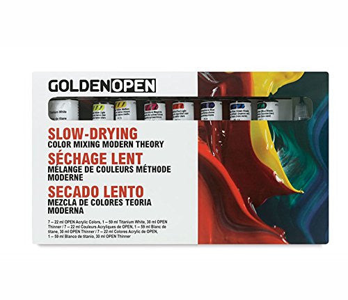 Golden OPEN Slow-Drying Color Mixing Set in Modern Theory colors provides a bright, clean pallet to produce a wide variety of hues, shades, and tints. They have a remarkably relaxed working property that facilitates blending, shading, softening, and glazing as well as fine detail work. Set contains eight tubes of 1 fluid ounce/30ml tubes in the following colors- Hansa Yellow Lt, Hansa Yellow Med, Naphthol Red Lt, Quinacridone Magenta, Anthraquinone Blue, Phthalo Blue (Green Shade), Phthalo Green (Blue Shade), Titanium White and OPEN Thinner.