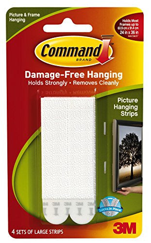 Picture hanging strips with Command Adhesive hold firmly where placed. Fasteners can be separated and reattached with the rubber resin adhesive. When removed, they come off cleanly without surface damage. Each set holds up to 4 lb. Liner is made of paper. Tape has a double-coat construction.