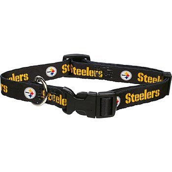 Pittsburgh Steelers NFL Dog CollarShow your true colors with our Pittsburgh Steelers NFL Dog Collar and turn an ordinary walk into a trip to your favorite stadium. Bright saturated colors scream for the home team as your dog cheers with you from the sidelines. Soft yet durable nylon webbing paired with easy to use plastic buckles and slide adjusters is just the ticket for your four-legged teammate. Pick up a matching leash and jersey (sold separately) to round out the outfit and prove your dog's got the most team spirit!