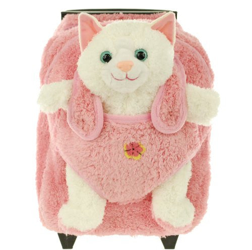 This superior backpack by Kreative Kids, Inc, will help you r little one white cat with green eyes and pink feet and ears. Padded shoulderstraps provide extra comfort. Locking handlebar and removable wheels.Stuffie with a zipper pocket on its back serves as an extra purse. Sure to enhance your image and help pull together your wardrobe! Measures 10 x 6 x 14 inches.Exciting and educational, this backpack would make a amazing gift for any child!