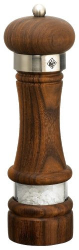 Exotic American black walnut Proview salt mill made by the experts at William Bounds is guaranteed not to react with moisture or corrode. The innovative ceramic grinding mechanism in the Proview mill lets you effortlessly process more spice than the average pepper mill. Makes a striking appearance in a clean Natural wood and features 3 coarseness levels for you to choose from. Clear section at bottom lets you see what type of salt you're grinding and when your mill needs a refill.