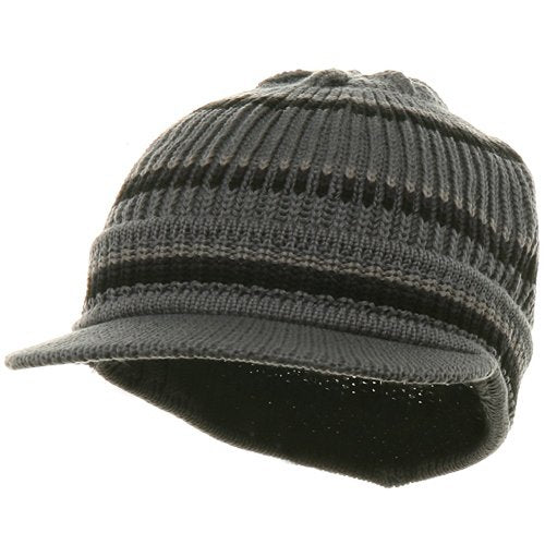Dress your head in this thick, snazzy striped beanie with visor to protect you from the elements in relaxed style. The hat is constructed out of 1 panel of chunky cotton rib knit, making this a stretchy, flexible hat with a lot of give. There is 1 gather at the top of the crown for a roomy dome shape with enough space for your locks. The modern grey hat is decorated with coordinating stripes of light grey, charcoal, and black woven into the knit. An elasticized cuff bands the opening to ensure a secure comfortable fit while the generous bill of 2-1/4 protects you from sun or snow. The natural material will naturally keep you ventilated while retaining your body temperature. Lightweight and easy to wear, this hat will serve you well. Made of 100% Cotton. Crown measures 8 deep, 8 wide. Bill measures 2-1/4 long. ONE SIZE fits most, from 6-7 5/8. Hand Wash. Imported. Available in Black, Brown, White, Grey, Khaki, Olive, and White.