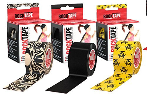 Rocktape is a premium kinesiology tape with a tighter weave, greater elasticity and stronger adhesive than other kinesiology tapes. It stays on longer and provides enhanced support, even under the toughest conditions. Extra elasticity promotes "snap back," helping muscles contract and relax more efficiently. This makes it ideal for high performance athletes and those competing in extreme sports. Rock Tape provides the same therapeutic benefits as regular kinesiology tape, but its unique properties, combined with an innovative taping method called PowerTaping, allow it to also enhance athletic performance. The biomechanical lifting action of the tape enhances both oxygen delivery and removal of lactic acid. This translates directly into greater endurance and faster recovery. This makes RockTape the most complete sports tape on the market. Each 2" x 16.4' roll has enough tape for numerous applications. And with a huge assortment of colors and patterns to choose from, you can make a fashion statement as you blow by the competition! Each single roll of RockTape comes in its own dispenser box and includes a full-color, 2-sided poster showing a variety of therapeutic and performance-enhancing applications.