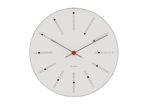 Originally created by Arne Jacobsen for Denmark's National bank over 30 years ago, Rosendahl has recreated the Banker's Clock to recreate a Danish treasure. Red in the center of the dial to faithfully reproduce the original colors and accents in black and white bring out the charm of the Bankers clock. Features an elongated bar for each hour, which consists of 12 blocks that provide a graphical representation of the time.