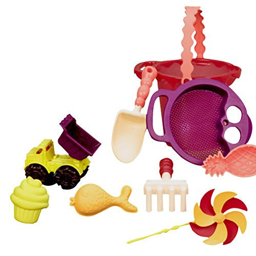 Enjoy hours of fun and learning with the B. Sands Ahoy Medium Bucket Set (Mango). Play at the beach or the sandbox with this vibrantly colored 9-piece set. Draw, smooth, and scoop with the sand rake and scoop. Sift and mold fun shapes with 3 assorted sand molds and sifter, decorate with the pinwheel, and drive the dump truck. Nest the sifter in the in the included bucket with the tools and molds for easy storage. This toy set is recommended for ages 18 months to 8 years.