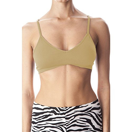Femine seamless sports bra with removable padding. Straps are adjustble, can choose between criss cross or straight. A one size fits most. Measurements when layed flat; Band: 10.5" Height (of the cup) 7.5".