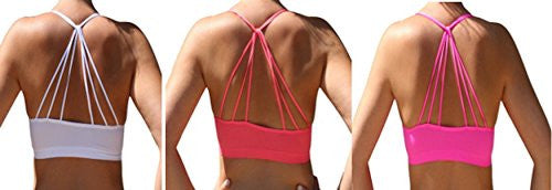 • Seamless Strappy Back Halter Bralette - White and Seamless Strappy Back Halter Bralette - Neon Pink and Seamless Strappy Back Halter Bralette - Coral, One Size (Pack of 3)