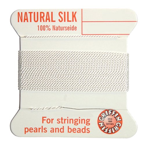 Griffin Silk Bead Cord is the most popular choice when tying knots between beads in the traditional pearl-knotted style or any design in which visible cord is an integral part. A twisted stainless steel beading needle is attached to one end of the 100 percent silk cord, making stringing fast and easy. Griffin Silk Bead Cord in size 2 is approximately 0.45mm (0.017 in.) in diameter and is a good choice for very small bead holes measuring around 0.5mm, like those found in gemstones and pearls. Approx. 79 inches (2 meters) of thread per card.