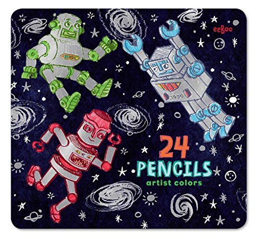 The eeBoo Silver Robots Colored Pencils come in a beautifully illustrated tin case by Brandon Reese. Both kids and adults will love creating vibrant pictures with the unique array of colors presented in this set. eeBoo colored pencils are perfect for adult coloring books and kids coloring books, as well as original sketch book art. Bring your pictures to life with color. These artist quality coloring pencils come pre-sharpened so you can start enjoying right out of the tin.