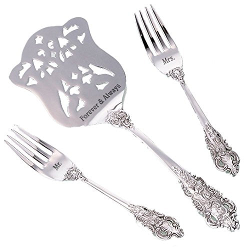 Lillian Rose 9.5" Mr. and Mrs. Silver Server and 6.5" Two Forks. Gleaming and gorgeous, this server/forks set is the perfect accessory for the cake table. "Mr." or "Mrs." on the forks and "Forever and Always" on the server make this set a beautiful keepsake for use at special occasions after the wedding day. The forks measure 6.5" and server measures 9.5". All three items are silver-plated.