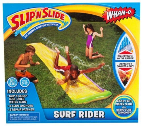 he Surf Rider Slip N Slide is a fun backyard water slide. The perfect activity for a hot summer day, the surf Rider has a wall of water down the side and on the bumper that keeps the slide continuously slippery ! Simply hook it to any standard garden hose. The water wall continuous spray keeps the slide filled with water and blasts you from head to toe !