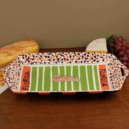 This Florida Gator 13'' platter is great for entertaining during gameday! Supporting your favorite college team is with this decorative University of Florida serving platter. UF tray features a polka dot border with a football field design at the center! Ceramic.