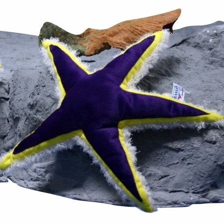 Beautiful larger sized plush toy starfish from Hansa. This high quality stuffed toy starfish has a white underbelly, with a purple top and yellow edge.