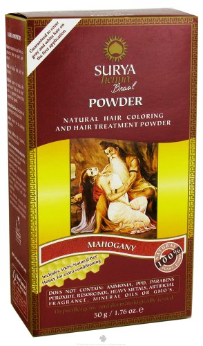 Surya Brasil Henna Powder Natural Hair Coloring and Hair Treatment Mahogony - 1.76 oz. (50 g) Surya Brasil Henna Powder colors while conditioning, moisturizing and revitalizing your hair. Surya formula nourishes hair for icreased luster, softness and elasticity. Surya Henna Brasil Powders unique coloing process does not strip the melanin from the cortex of the hair, but rather forms a protective coat of rich semi-permanent color around each strand. Henna Powder is the only product 100% natural, with no conservatives or chemical elements, but only herbs and fruits imported from India and Brazil (Amazon) which go through a process of drying and milling. It also colors white hair while provides treatment, due to its conditioning, toning, fungi static and bacteriostatic action, which prevents from hair fall and dandruff. Since it is totally natural, it does not contain peroxide, ammonia or heavy metals and it can also be used for children, people allergic to chemicals, pregnant women or people undergoing chemotherapeutic treatment. Formulated with 100% plant ingredients, it contains henna (Lawsonia inermis) as its main ingredient - a plant possessing a natural dye that has great affinity with the hair. In addition to coloring, henna lawsone molecules coat damaged hair to restore damaged cuticles and leave the hair more sleek and smooth. It may be applied immediately after chemical processes (permanents, straighteners, relaxers, etc.) Because it is a semi-permanent hair coloring, it gradually washes out and does not stain. It is not tested on animals and contains no ingredients derived from animals. In addition to coloring, Surya Henna Powder also moisturizes, revitalizes and nourishes the hair, promoting more shine, smoothness and resilience. It colors without breaking the hair keratin structure and coats each strand with a protective film. To secure enhanced hair coloring results and intensive treatment, Surya Henna Powder is enriched with other plants nat