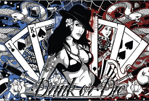 Artwork is digitally printed on table. Get this unique, edgy design with everything having to do with tattoos. Skulls, cards, pin up girl, koi, dragons, knifes, liquor, snakes, etc.