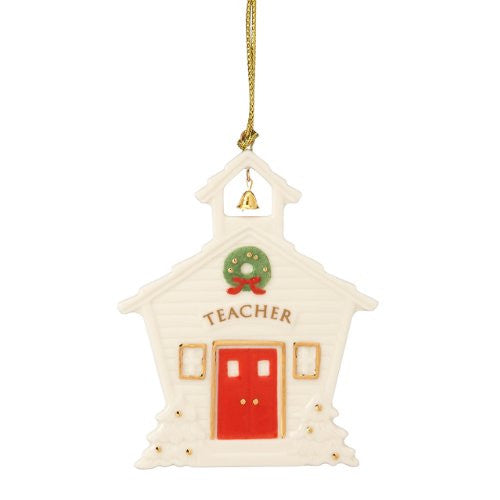 Your child's teachers will appreciate this gift for Christmases to come. It's a sculpted schoolhouse, complete with a tiny bell at the top. The front of the schoolhouse bears a festive wreath and "TEACHER" in gold. Crafted of Lenox hand-painted porcelain accented with gold. Includes gold tassel cord for hanging. Height: 3 1/2".