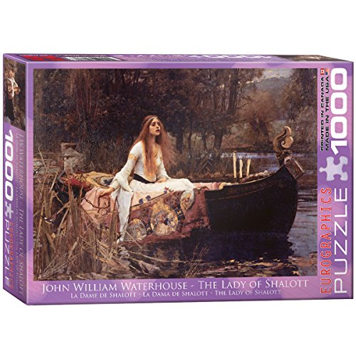 EuroGraphics Lady of Shalott by John William Waterhouse 1000-Piece Puzzle. Box size: 10" x 14" x 2.37". Finished Size: 19.25" x 26.5". Throughout his career John William Waterhouse (1849-1917) painted romantic and poetic subjects, often featuring women characterized by their wistful expression and haunting sensuality. Strong high-quality puzzle pieces. Made from recycled board and printed with vegetable based ink. This superior quality puzzle will delight and educate all at the same time.